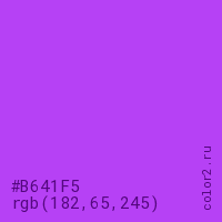 Цвет #B641F5 в цветовой модели RGB обозначается тремя октетами (182, 65, 245) в десятичном формате и #B641F5 в шестнадцатиричном (hex) формате, которые являются интенсивностью красного 182 (hex B6), интенсивность зелёного 65 (hex 41) и интенсивность синего 245 (hex F5).