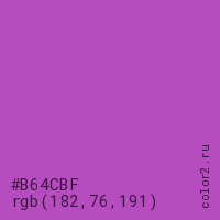 Цвет #B64CBF в цветовой модели RGB обозначается тремя октетами (182, 76, 191) в десятичном формате и #B64CBF в шестнадцатиричном (hex) формате, которые являются интенсивностью красного 182 (hex B6), интенсивность зелёного 76 (hex 4C) и интенсивность синего 191 (hex BF).