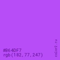 Цвет #B64DF7 в цветовой модели RGB обозначается тремя октетами (182, 77, 247) в десятичном формате и #B64DF7 в шестнадцатиричном (hex) формате, которые являются интенсивностью красного 182 (hex B6), интенсивность зелёного 77 (hex 4D) и интенсивность синего 247 (hex F7).