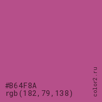 Цвет #B64F8A в цветовой модели RGB обозначается тремя октетами (182, 79, 138) в десятичном формате и #B64F8A в шестнадцатиричном (hex) формате, которые являются интенсивностью красного 182 (hex B6), интенсивность зелёного 79 (hex 4F) и интенсивность синего 138 (hex 8A).