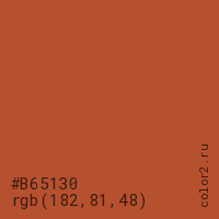 Цвет #B65130 в цветовой модели RGB обозначается тремя октетами (182, 81, 48) в десятичном формате и #B65130 в шестнадцатиричном (hex) формате, которые являются интенсивностью красного 182 (hex B6), интенсивность зелёного 81 (hex 51) и интенсивность синего 48 (hex 30).