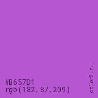 Цвет #B657D1 в цветовой модели RGB обозначается тремя октетами (182, 87, 209) в десятичном формате и #B657D1 в шестнадцатиричном (hex) формате, которые являются интенсивностью красного 182 (hex B6), интенсивность зелёного 87 (hex 57) и интенсивность синего 209 (hex D1).