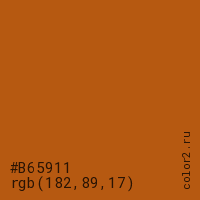 Цвет #B65911 в цветовой модели RGB обозначается тремя октетами (182, 89, 17) в десятичном формате и #B65911 в шестнадцатиричном (hex) формате, которые являются интенсивностью красного 182 (hex B6), интенсивность зелёного 89 (hex 59) и интенсивность синего 17 (hex 11).