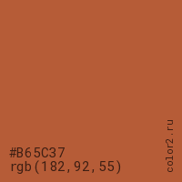 Цвет #B65C37 в цветовой модели RGB обозначается тремя октетами (182, 92, 55) в десятичном формате и #B65C37 в шестнадцатиричном (hex) формате, которые являются интенсивностью красного 182 (hex B6), интенсивность зелёного 92 (hex 5C) и интенсивность синего 55 (hex 37).