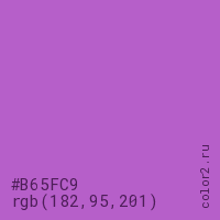 Цвет #B65FC9 в цветовой модели RGB обозначается тремя октетами (182, 95, 201) в десятичном формате и #B65FC9 в шестнадцатиричном (hex) формате, которые являются интенсивностью красного 182 (hex B6), интенсивность зелёного 95 (hex 5F) и интенсивность синего 201 (hex C9).