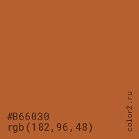 Цвет #B66030 в цветовой модели RGB обозначается тремя октетами (182, 96, 48) в десятичном формате и #B66030 в шестнадцатиричном (hex) формате, которые являются интенсивностью красного 182 (hex B6), интенсивность зелёного 96 (hex 60) и интенсивность синего 48 (hex 30).