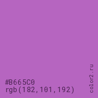 Цвет #B665C0 в цветовой модели RGB обозначается тремя октетами (182, 101, 192) в десятичном формате и #B665C0 в шестнадцатиричном (hex) формате, которые являются интенсивностью красного 182 (hex B6), интенсивность зелёного 101 (hex 65) и интенсивность синего 192 (hex C0).