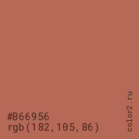 Цвет #B66956 в цветовой модели RGB обозначается тремя октетами (182, 105, 86) в десятичном формате и #B66956 в шестнадцатиричном (hex) формате, которые являются интенсивностью красного 182 (hex B6), интенсивность зелёного 105 (hex 69) и интенсивность синего 86 (hex 56).