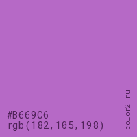 Цвет #B669C6 в цветовой модели RGB обозначается тремя октетами (182, 105, 198) в десятичном формате и #B669C6 в шестнадцатиричном (hex) формате, которые являются интенсивностью красного 182 (hex B6), интенсивность зелёного 105 (hex 69) и интенсивность синего 198 (hex C6).