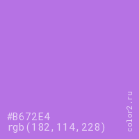 Цвет RGB(182, 114, 228) в процентом отношении количества цвета состоит из 71.4% красного (red), 44.7% зелёного (green) и 89.4% синего (blue).