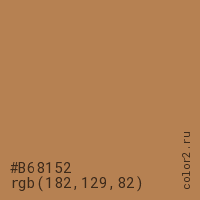 Цвет #B68152 в цветовой модели RGB обозначается тремя октетами (182, 129, 82) в десятичном формате и #B68152 в шестнадцатиричном (hex) формате, которые являются интенсивностью красного 182 (hex B6), интенсивность зелёного 129 (hex 81) и интенсивность синего 82 (hex 52).