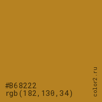 Цвет #B68222 в цветовой модели RGB обозначается тремя октетами (182, 130, 34) в десятичном формате и #B68222 в шестнадцатиричном (hex) формате, которые являются интенсивностью красного 182 (hex B6), интенсивность зелёного 130 (hex 82) и интенсивность синего 34 (hex 22).