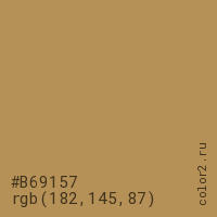 Цвет #B69157 в цветовой модели RGB обозначается тремя октетами (182, 145, 87) в десятичном формате и #B69157 в шестнадцатиричном (hex) формате, которые являются интенсивностью красного 182 (hex B6), интенсивность зелёного 145 (hex 91) и интенсивность синего 87 (hex 57).