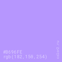 Цвет #B696FE в цветовой модели RGB обозначается тремя октетами (182, 150, 254) в десятичном формате и #B696FE в шестнадцатиричном (hex) формате, которые являются интенсивностью красного 182 (hex B6), интенсивность зелёного 150 (hex 96) и интенсивность синего 254 (hex FE).