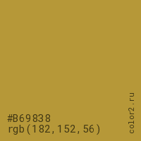 Цвет #B69838 в цветовой модели RGB обозначается тремя октетами (182, 152, 56) в десятичном формате и #B69838 в шестнадцатиричном (hex) формате, которые являются интенсивностью красного 182 (hex B6), интенсивность зелёного 152 (hex 98) и интенсивность синего 56 (hex 38).