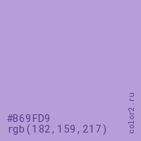 Цвет #B69FD9 в цветовой модели RGB обозначается тремя октетами (182, 159, 217) в десятичном формате и #B69FD9 в шестнадцатиричном (hex) формате, которые являются интенсивностью красного 182 (hex B6), интенсивность зелёного 159 (hex 9F) и интенсивность синего 217 (hex D9).