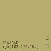 Цвет #B6AC6D в цветовой модели RGB обозначается тремя октетами (182, 172, 109) в десятичном формате и #B6AC6D в шестнадцатиричном (hex) формате, которые являются интенсивностью красного 182 (hex B6), интенсивность зелёного 172 (hex AC) и интенсивность синего 109 (hex 6D).
