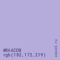 Цвет #B6ACDB в цветовой модели RGB обозначается тремя октетами (182, 172, 219) в десятичном формате и #B6ACDB в шестнадцатиричном (hex) формате, которые являются интенсивностью красного 182 (hex B6), интенсивность зелёного 172 (hex AC) и интенсивность синего 219 (hex DB).