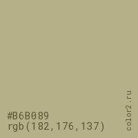 Цвет #B6B089 в цветовой модели RGB обозначается тремя октетами (182, 176, 137) в десятичном формате и #B6B089 в шестнадцатиричном (hex) формате, которые являются интенсивностью красного 182 (hex B6), интенсивность зелёного 176 (hex B0) и интенсивность синего 137 (hex 89).