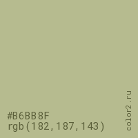Цвет #B6BB8F в цветовой модели RGB обозначается тремя октетами (182, 187, 143) в десятичном формате и #B6BB8F в шестнадцатиричном (hex) формате, которые являются интенсивностью красного 182 (hex B6), интенсивность зелёного 187 (hex BB) и интенсивность синего 143 (hex 8F).