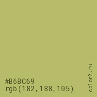 Цвет #B6BC69 в цветовой модели RGB обозначается тремя октетами (182, 188, 105) в десятичном формате и #B6BC69 в шестнадцатиричном (hex) формате, которые являются интенсивностью красного 182 (hex B6), интенсивность зелёного 188 (hex BC) и интенсивность синего 105 (hex 69).