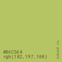 Цвет #B6C564 в цветовой модели RGB обозначается тремя октетами (182, 197, 100) в десятичном формате и #B6C564 в шестнадцатиричном (hex) формате, которые являются интенсивностью красного 182 (hex B6), интенсивность зелёного 197 (hex C5) и интенсивность синего 100 (hex 64).