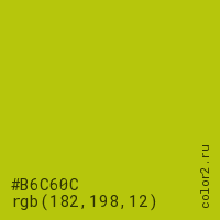 Цвет #B6C60C в цветовой модели RGB обозначается тремя октетами (182, 198, 12) в десятичном формате и #B6C60C в шестнадцатиричном (hex) формате, которые являются интенсивностью красного 182 (hex B6), интенсивность зелёного 198 (hex C6) и интенсивность синего 12 (hex 0C).