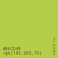 Цвет #B6CD49 в цветовой модели RGB обозначается тремя октетами (182, 205, 73) в десятичном формате и #B6CD49 в шестнадцатиричном (hex) формате, которые являются интенсивностью красного 182 (hex B6), интенсивность зелёного 205 (hex CD) и интенсивность синего 73 (hex 49).