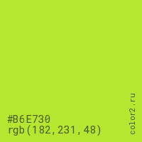 Цвет #B6E730 в цветовой модели RGB обозначается тремя октетами (182, 231, 48) в десятичном формате и #B6E730 в шестнадцатиричном (hex) формате, которые являются интенсивностью красного 182 (hex B6), интенсивность зелёного 231 (hex E7) и интенсивность синего 48 (hex 30).