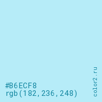 Цвет #B6ECF8 в цветовой модели RGB обозначается тремя октетами (182, 236, 248) в десятичном формате и #B6ECF8 в шестнадцатиричном (hex) формате, которые являются интенсивностью красного 182 (hex B6), интенсивность зелёного 236 (hex EC) и интенсивность синего 248 (hex F8).