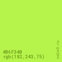 Цвет #B6F34B в цветовой модели RGB обозначается тремя октетами (182, 243, 75) в десятичном формате и #B6F34B в шестнадцатиричном (hex) формате, которые являются интенсивностью красного 182 (hex B6), интенсивность зелёного 243 (hex F3) и интенсивность синего 75 (hex 4B).