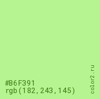 Цвет #B6F391 в цветовой модели RGB обозначается тремя октетами (182, 243, 145) в десятичном формате и #B6F391 в шестнадцатиричном (hex) формате, которые являются интенсивностью красного 182 (hex B6), интенсивность зелёного 243 (hex F3) и интенсивность синего 145 (hex 91).