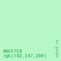 Цвет #B6F7C8 в цветовой модели RGB обозначается тремя октетами (182, 247, 200) в десятичном формате и #B6F7C8 в шестнадцатиричном (hex) формате, которые являются интенсивностью красного 182 (hex B6), интенсивность зелёного 247 (hex F7) и интенсивность синего 200 (hex C8).
