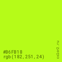 Цвет #B6FB18 в цветовой модели RGB обозначается тремя октетами (182, 251, 24) в десятичном формате и #B6FB18 в шестнадцатиричном (hex) формате, которые являются интенсивностью красного 182 (hex B6), интенсивность зелёного 251 (hex FB) и интенсивность синего 24 (hex 18).