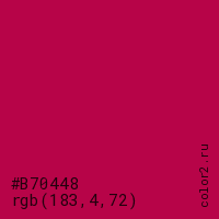 Цвет #B70448 в цветовой модели RGB обозначается тремя октетами (183, 4, 72) в десятичном формате и #B70448 в шестнадцатиричном (hex) формате, которые являются интенсивностью красного 183 (hex B7), интенсивность зелёного 4 (hex 04) и интенсивность синего 72 (hex 48).