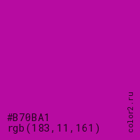 Цвет #B70BA1 в цветовой модели RGB обозначается тремя октетами (183, 11, 161) в десятичном формате и #B70BA1 в шестнадцатиричном (hex) формате, которые являются интенсивностью красного 183 (hex B7), интенсивность зелёного 11 (hex 0B) и интенсивность синего 161 (hex A1).