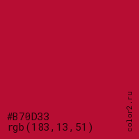 Цвет #B70D33 в цветовой модели RGB обозначается тремя октетами (183, 13, 51) в десятичном формате и #B70D33 в шестнадцатиричном (hex) формате, которые являются интенсивностью красного 183 (hex B7), интенсивность зелёного 13 (hex 0D) и интенсивность синего 51 (hex 33).