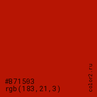 Цвет #B71503 в цветовой модели RGB обозначается тремя октетами (183, 21, 3) в десятичном формате и #B71503 в шестнадцатиричном (hex) формате, которые являются интенсивностью красного 183 (hex B7), интенсивность зелёного 21 (hex 15) и интенсивность синего 3 (hex 03).