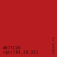 Цвет #B71C20 в цветовой модели RGB обозначается тремя октетами (183, 28, 32) в десятичном формате и #B71C20 в шестнадцатиричном (hex) формате, которые являются интенсивностью красного 183 (hex B7), интенсивность зелёного 28 (hex 1C) и интенсивность синего 32 (hex 20).