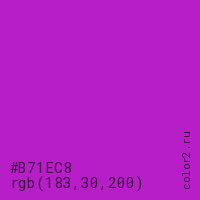 Цвет #B71EC8 в цветовой модели RGB обозначается тремя октетами (183, 30, 200) в десятичном формате и #B71EC8 в шестнадцатиричном (hex) формате, которые являются интенсивностью красного 183 (hex B7), интенсивность зелёного 30 (hex 1E) и интенсивность синего 200 (hex C8).