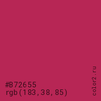 Цвет #B72655 в цветовой модели RGB обозначается тремя октетами (183, 38, 85) в десятичном формате и #B72655 в шестнадцатиричном (hex) формате, которые являются интенсивностью красного 183 (hex B7), интенсивность зелёного 38 (hex 26) и интенсивность синего 85 (hex 55).