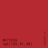 Цвет #B72930 в цветовой модели RGB обозначается тремя октетами (183, 41, 48) в десятичном формате и #B72930 в шестнадцатиричном (hex) формате, которые являются интенсивностью красного 183 (hex B7), интенсивность зелёного 41 (hex 29) и интенсивность синего 48 (hex 30).