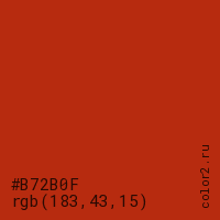 Цвет #B72B0F в цветовой модели RGB обозначается тремя октетами (183, 43, 15) в десятичном формате и #B72B0F в шестнадцатиричном (hex) формате, которые являются интенсивностью красного 183 (hex B7), интенсивность зелёного 43 (hex 2B) и интенсивность синего 15 (hex 0F).