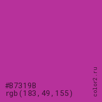Цвет #B7319B в цветовой модели RGB обозначается тремя октетами (183, 49, 155) в десятичном формате и #B7319B в шестнадцатиричном (hex) формате, которые являются интенсивностью красного 183 (hex B7), интенсивность зелёного 49 (hex 31) и интенсивность синего 155 (hex 9B).