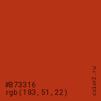 Цвет #B73316 в цветовой модели RGB обозначается тремя октетами (183, 51, 22) в десятичном формате и #B73316 в шестнадцатиричном (hex) формате, которые являются интенсивностью красного 183 (hex B7), интенсивность зелёного 51 (hex 33) и интенсивность синего 22 (hex 16).