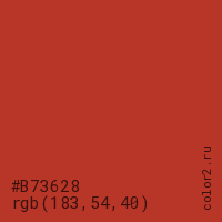 Цвет #B73628 в цветовой модели RGB обозначается тремя октетами (183, 54, 40) в десятичном формате и #B73628 в шестнадцатиричном (hex) формате, которые являются интенсивностью красного 183 (hex B7), интенсивность зелёного 54 (hex 36) и интенсивность синего 40 (hex 28).