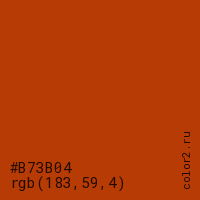 Цвет #B73B04 в цветовой модели RGB обозначается тремя октетами (183, 59, 4) в десятичном формате и #B73B04 в шестнадцатиричном (hex) формате, которые являются интенсивностью красного 183 (hex B7), интенсивность зелёного 59 (hex 3B) и интенсивность синего 4 (hex 04).