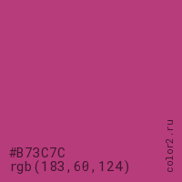 Цвет #B73C7C в цветовой модели RGB обозначается тремя октетами (183, 60, 124) в десятичном формате и #B73C7C в шестнадцатиричном (hex) формате, которые являются интенсивностью красного 183 (hex B7), интенсивность зелёного 60 (hex 3C) и интенсивность синего 124 (hex 7C).
