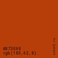 Цвет #B73E08 в цветовой модели RGB обозначается тремя октетами (183, 62, 8) в десятичном формате и #B73E08 в шестнадцатиричном (hex) формате, которые являются интенсивностью красного 183 (hex B7), интенсивность зелёного 62 (hex 3E) и интенсивность синего 8 (hex 08).