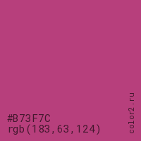 Цвет #B73F7C в цветовой модели RGB обозначается тремя октетами (183, 63, 124) в десятичном формате и #B73F7C в шестнадцатиричном (hex) формате, которые являются интенсивностью красного 183 (hex B7), интенсивность зелёного 63 (hex 3F) и интенсивность синего 124 (hex 7C).